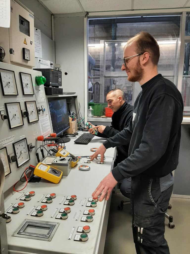 Forte d’une équipe de 3 personnes et véritable « Tour de contrôle » de l’atelier, la plateforme d’essais est impliquée dès le début du processus de fabrication des transformateurs. Nos techniciens d’essais interviennent en effet pour contrôler la qualité et la conformité des bobinages par rapport aux fiches de conception fournies par le bureau d’études, puis aux différentes étapes de la production jusqu’à la réception finale des appareils souvent en présence du client, appelée